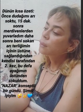 Yaptığı paylaşım videosunda neler olduğunu anlatan Demet Evgar, “Dünün kısa özeti; önce dudağımı arı soktu, 15 dakika sonra merdivenlerden yuvarlandım. Daha sonra beni sokan arı, terliğimin içinin üstüne saklandığından; kendisi tarafından ikinci kez, bu defa ayağımın üstünden sokuldum. ‘Nazar’ konseptli bir gündü. Şimdi iyiyim” dedi.