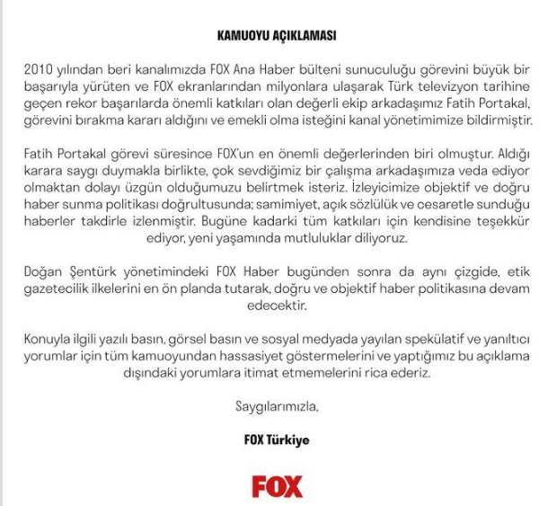 “”2010 yılından beri kanalımızda Fox Ana Haber bülteni sunuculuğu görevini büyük bir başarıyla yürüten ve FOX ekranlarından milyonlara ulaşarak Türk televizyon tarihine geçen rekor başarılarda önemli katkıları olan değerli ekip arkadaşımız Fatih Portakal, görevini bırakma kararı aldığını ve emekli olma isteğini kanal yönetimimize bildirmiştir.