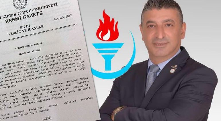 Okan Erdemsiz’in 7 Ocak 2018 yılındaki seçime YDP Girne Milletvekili adayı olarak katılmak istediği ancak Yüksek Seçim Kurulu’nun onay vermediği için aday olamadığı Resmi Gazete’de 7 Aralık 2017 tarihinde yayınlanmıştı.