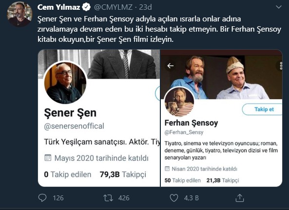 “Şener Şen ve Ferhan Şensoy adıyla açılan ısrarla onlar adına zırvalamaya devam eden bu iki hesabı takip etmeyin. Bir Ferhan Şensoy kitabı okuyun,bir Şener Şen filmi izleyin.”