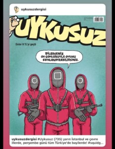 Squid Game’in kapağa konu olan sahnesinde yarışmaya katılanların elenme kelimesinin karşılığının ölüm olduğu gerçeğini anlayınca oyunun ardından sağ kalanlar isyan çıkararak yarışmadan çekilmek istiyorlar.