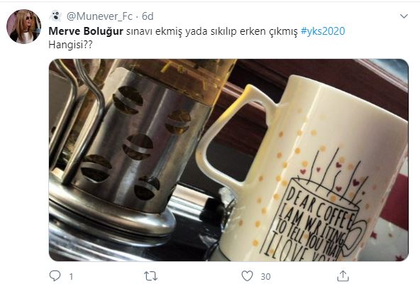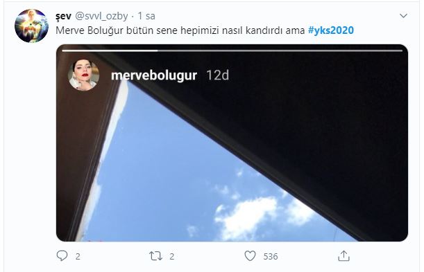 Nisan ayında YKS için hazırlık yaptığını paylaştığı görsellerle duyuran Merve Boluğur, üniversiteye gitmek istediğini hayranları ile paylaşmıştı. Sosyal medya üzerinden YKS için test çözdüğü fotoğrafları da paylaşan Merve Boluğur, YKS’nin TYT oturumunun gerçekleştiği anlarda evinden bitki çayı ve manzara fotoğrafı paylaştı. Boluğur’un bu paylaşımı, Twitter gündeminde de yer aldı. İşte, o paylaşımlar;